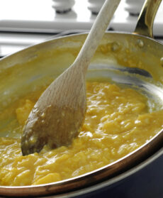 Cuoci le uova. Prosegui la cottura a fuoco basso, mescolando spesso con un cucchiaio di legno per staccare dal fondo le uova rapprese e, quando queste risulteranno opache e addensate, ma ancora cremose, togli la padella dal bagnomaria.