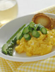 4) Picchietta con un cucchiaino la sommita di ciascun uovo ed elimina la calotta. Distribuisci sulle uova lo yogurt, un pizzico di sale e una macinata di pepe; quindi suddividi nei piattini i bastoncini di verdure da intingere nei tuorli.
