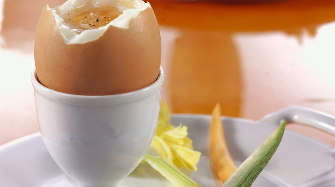 3) Adagia le uova in una casseruola, versa acqua fredda, fino a coprirle di almeno 2 dita. Porta l'acqu a a ebolllizione e cuocile per circa 3 minuti. Sgocciolale con un mestolo forato e sistemale nei portauova, posti su 4 piattini.