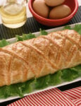 3) Forma del polpettone. Plasma l’impasto preparato con le mani inumidite, forma il polpettone e rivestilo completamente con le fettine di lardo, fermale legando il polpettone con lo spago da cucina e passalo nella farina; fai fondere il burro in una casseruola e rosola bene il polpettone da tutte le parti girandolo delicatamente, poi aggiungi in pentola la salvia, il rosmarino e l'aglio sbucciato e privato dell'eventuale germoglio.