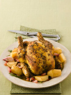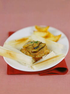 Bocconcini al ginepro con tortino di topinambur e chips di verza