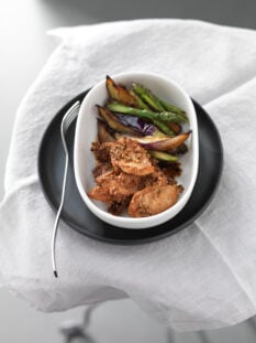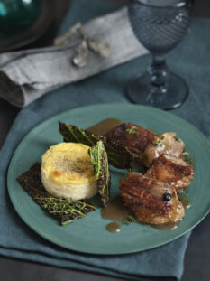 Coscia d’oca con mele al caramello e sformato di asprelle