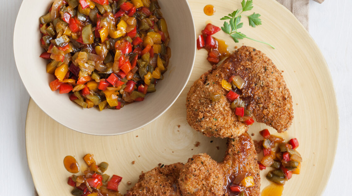 4) Scalda in padella abbondante olio per friggere e, quando è ben caldo, immergi le ali di pollo impanate poche alla vota. Girale su tutte i lati e quando risultano dorate, scolale e asciugale su carta assorbente per eliminare l’eccesso di unto. Porta in tavola le ali di pollo calde, accompagnate con la salsa di peperoni caramellati.