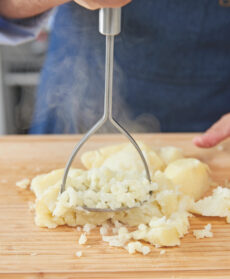 Lavate le patate in acqua fredda e cuocetele al vapore per 20-30 minuti, secondo la grandezza. Verificate la cottura pungendo le patate con uno stuzzicadenti. Sbucciatele e passatele su un tagliere con lo schiacciapatate.