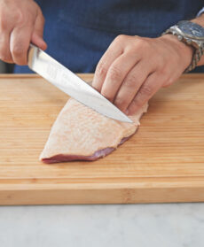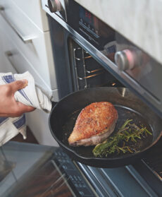 Scaldate il forno a 200° in modalità statica per evitare che la carne si asciughi troppo. Sistemate direttamente la padella in forno, se ha il manico di ferro, o trasferite i petti in una teglia preriscaldata. Cuocete per 8 minuti. Coprite e lasciate riposare i petti per almeno 2 minuti prima di estrarli dalla pentola e tagliarli a fette.