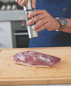 Salateli e pepateli su entrambi i lati. Sistemateli in una grande padella fredda e senza condimenti aggiunti con la pelle rivolta verso il basso.