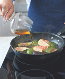 Disponeteli in padella con la buccia rivolta verso il basso con un filo d'olio. Cuoceteli per 4 minuti, aggiungete la menta e sfumate con il Brandy o il Cognac. Lasciate evaporare e proseguite la cottura per 3 minuti. Servite il petto d'anatra con il morbido di patate decorato con zeste di limone, i fichi tagliati e la saba.