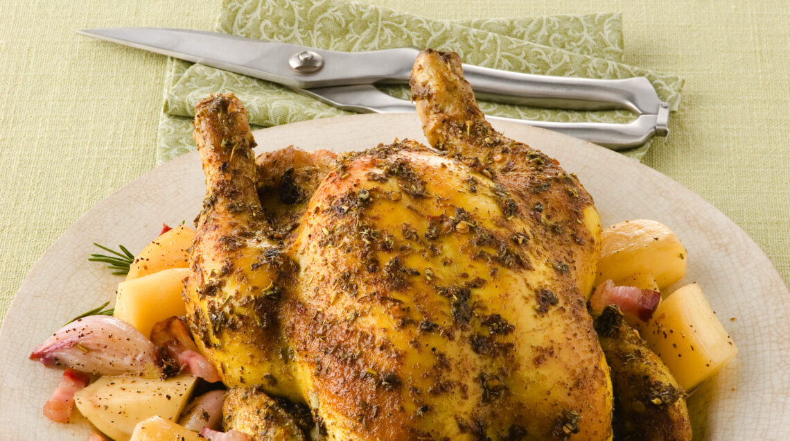 1) In una terrina, mescola curcuma, peperoncino, cannella, cumino, le erbe aromatiche, un pizzico di sale e lo spicchio d’aglio tritato. Strofina ora il pollo, che avrai precedentemente pulito, con questa miscela. Condisci la carne con un filo d’olio, trasferiscila su di una placca foderata di carta forno e cuoci per 15 minuti a 200°. Trascorso il tempo, irrora l’arrosto con un bicchiere di vino bianco e rimetti in forno ancora per 40 minuti, abbassando la temperatura a 180°. Di tanto in tanto, controlla che l’arrosto non si secchi troppo e bagnalo con il suo fondo di cottura.