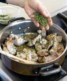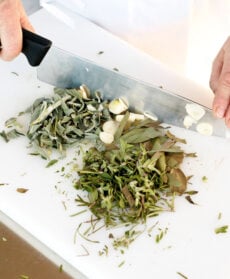 1) Iniziate a preparare il coniglio alla ligure tagliando il coniglio a pezzi. Tritate finemente la salvia, il timo e la maggiorana insieme all’aglio. Mettete il trito in una ciotola e aggiungete sale e pepe a vostro piacere.