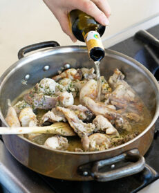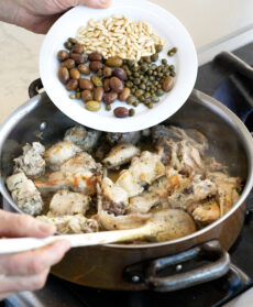 5) Passate i capperi sotto l’acqua corrente per dissalarli. Asciugateli e poi adagiateli su di un piatto insieme alle olive e ai pinoli. Versate i capperi, le olive e i pinoli nel tegame nel quale sta cuocendo il coniglio e fate cuocere ancora per circa 10 minuti a fuoco vivo. Poi togliete dal fuoco e impiattate il vostro coniglio alla ligure.