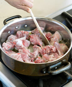 2) Fate rosolare il coniglio all’interno di un tegame con 3 cucchiai di olio extravergine d’oliva. Durante la cottura, mescolate con un cucchiaio di legno.