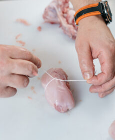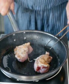 Disossate le cosce di coniglio (oppure chiedete al macellaio di farlo per voi), salatele, pepatele, arrotolatele e legatele come piccoli arrostini.