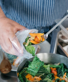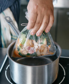 Mettete i sacchetti in una grossa pentola riempita per metà con acqua bollente e cuocete per 6 ore a fuoco basso in modo che l'acqua non raggiunga mai il bollore. Aprite i sacchetti, versate il bottaggio in una pentola, fate ridurre un poco il sugo a fuoco medio e servite.