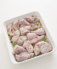 Spellate gli spicchi d'aglio e tritateli fini con le foglie di prezzemolo pulite; mettete il mix in una pirofila con il succo del limone, il vino, 1 cucchiaio di olio extravergine, sale e una macinata di pepe. Mescolate e immergete nella marinata i pezzi di coniglio. Lasciate riposare per 1 ora a temperatura ambiente, rigirando ogni tanto la carne.