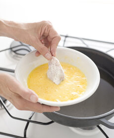 Sgocciolate i pezzi di coniglio dalla marinata e tamponateli con carta da cucina per asciugarli. Passateli in abbondante farina, poi immergeteli nelle uova sbattute con il grana grattugiato (se volete, potete infarinare la carne, passarla nelle uova sbattute e infine anche nel pangrattato).