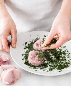 Taglia a fette dello spessore di un paio di cm 2 lombate di coniglio disossate e passale in un trito di rosmarino, aglio e finocchietto, poi avvolgi ciascuna, tutt’intorno ai bordi, in una fettina di pancetta tesa, fermandola con uno stecchino.