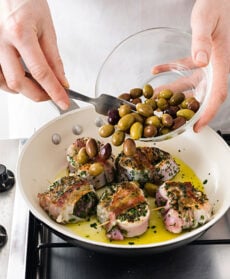 Servi le lombatine in porchetta con le olive.