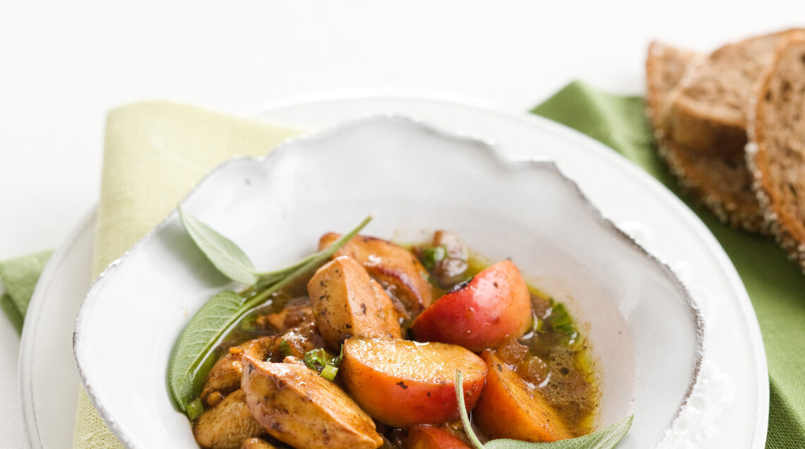2) Unisci i tocchetti di pollo e fai rosolare su fuoco vivace per qualche minuto, finché saranno dorati e quindi le meline, lavate e tagliate a spicchi.
