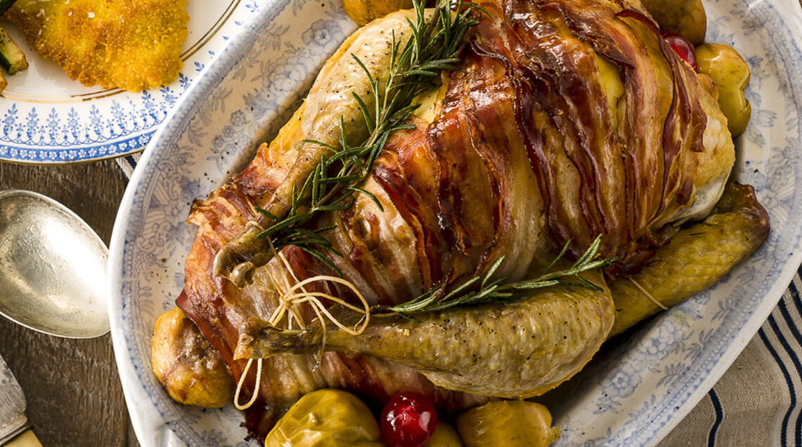 Il volatile intero, farcito con tenero vitello e ciliegine di mostarda e bardato con fettine di pancetta, è cotto al forno con vino bianco. Perfetto per la tavola delle feste