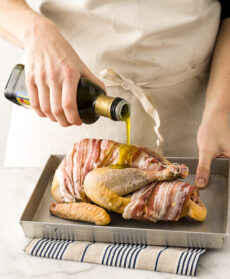 Un secondo di carne al forno raffinato per le occasioni speciali. Il volatile, farcito con tenero vitello, è bardato con fettine di pancetta