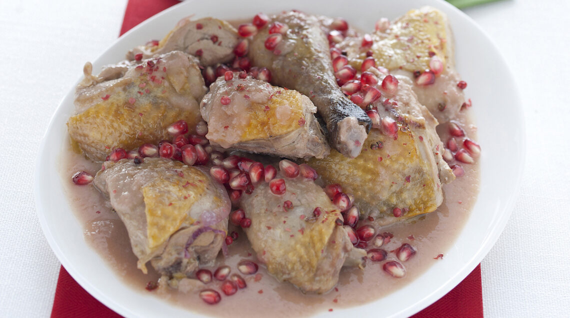 Un volatile pregiato, dalle carni magre, per le Feste si impreziosisce con lucidi chicchi che donano freschezza a questo elegante secondo piatto