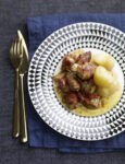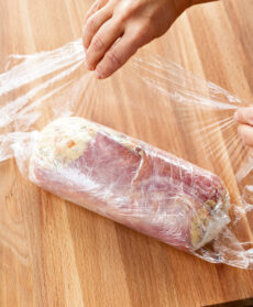 3) Arrotola la galantina e avvolgila prima in pellicola da cucina, poi in un foglio d'alluminio. Cuocila in forno a 180° per 45-50 minuti. Nella ricetta originale la galantina viene avvolta in una rete per arrosti e cotta nel forno a vapore finché la temperatura interna (misurata con l'apposito termometro a sonda) raggiunge gli 85°: se hai gli strumenti necessari, puoi procedere così.