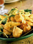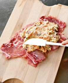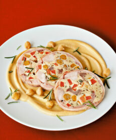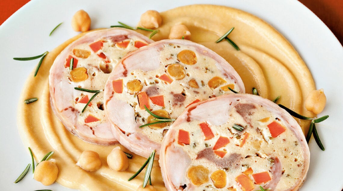 4) Al momento di servire, taglia la galantina a fette dello spessore di circa mezzo cm e sistemala sui piatti su cui avrai steso la crema di ceci; guarnisci, se ti piace, con rosmarino e ceci interi.