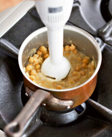 1) Prepara la crema di ceci: fai soffriggere in 2 cucchiai di olio uno spicchio d'aglio schiacciato, la cipolla tritata, un rametto di rosmarino, 150 g di ceci e gli ossi del coniglio. Quando questi ultimi sono dorati bagna con il brodo (meno qualche cucchiaio) e continua la cottura per circa mezz'ora. Alla fine elimina gli ossi, il rosmarino e l'aglio e frulla il resto con il frullatore a immersione; se la crema risulta troppo densa aggiungi il rimanente brodo; salala, pepala e tienila da parte.