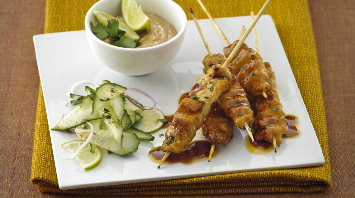 Con il termine "satay” (o saté) si intende una particolare marinatura e cottura utilizzata in molti paesi asiatici per carne, verdure, frutti di mare e gamberi. È poi diventato il nome del piatto, costituito da dadi di carne di pollo o di manzo marinati, infilzati su spiedini, cotti alla brace e serviti con una salsa di arachidi leggermente piccante.