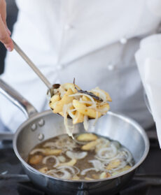 Nel frattempo, affettate le cipolle e tagliate a spicchi le patate sbucciate. Mettete in una padella a bordi alti abbondante grasso d'oca e fatelo fondere. Aggiungete le patate e lasciatele dorare; a metà cottura circa, unite anche le cipolle; scolate il tutto su carta assorbente e spolverizzate di sale.