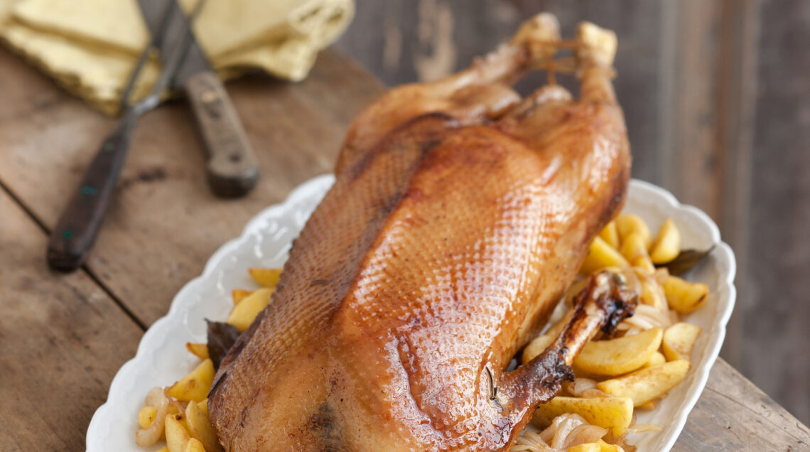 Scolate l'oca su un piatto da portata e servitela accompagnandola con le patate e le cipolle fritte.