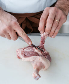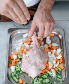 Appoggiate sul tagliere la coscia d'oca e con un robusto coltellino scalcate l'osso della sopracoscia. Tagliate le verdure a pezzetti.