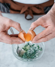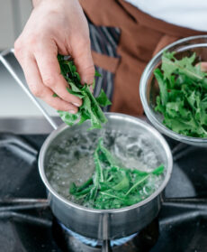 Scolatele, tagliuzzatele e saltatele in padella con 20 g di burro e l'aglio; eliminate l'aglio, mettetele in una ciotola e mescolatevi la ricotta, l'uovo, sale e pepe.