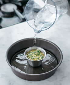 Versate il composto in uno stampino a pareti alte e lisce, imburrato con il restante burro, mettetelo in una teglia, versate nel recipiente un paio di bicchieri di acqua e cuocete a bagnomaria in forno a 170° per 15-20 minuti.