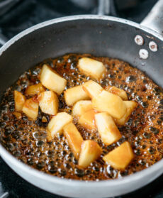 Per la guarnizione sbucciate la mela e tagliatela a cubetti. In una padellina a fondo spesso cuocete lo zucchero fino a ottenere un caramello biondo, unite i cubetti di mela, mescolate, bagnate con l'aceto, salate e togliete dal fuoco. Mettete sul piatto la coscia d'oca, irroratela con il suo fondo di cottura filtrato, sistematevi accanto lo sformatino di asprelle, completate con le mele caramellate e guarnite con la pancetta tostate in forno spezzettata.