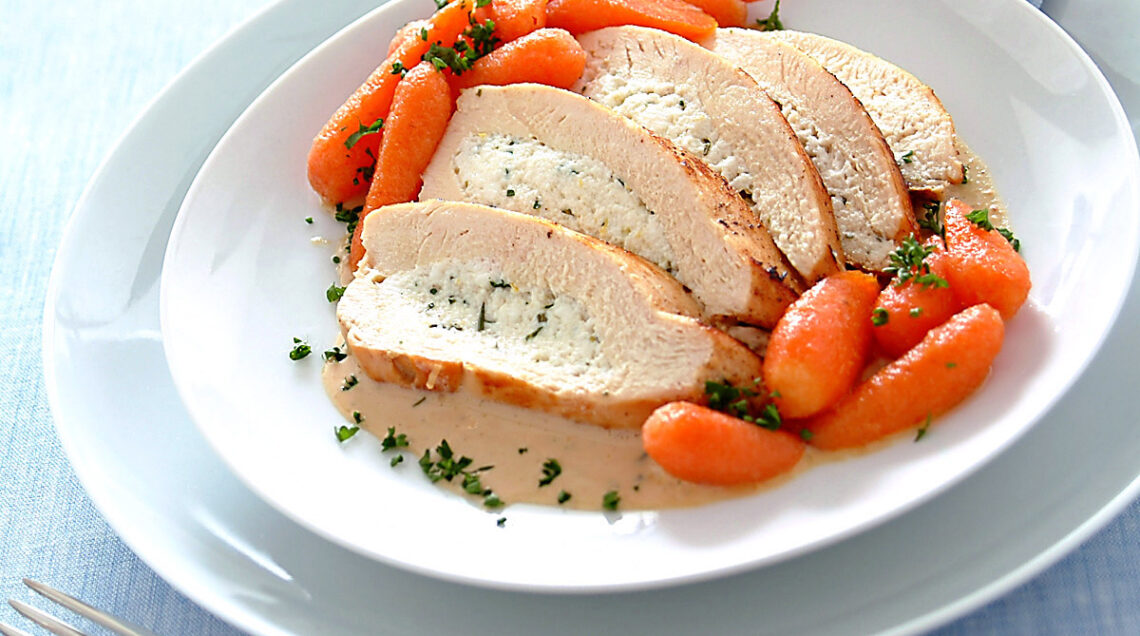 La ricetta del petto di pollo ripieno e carotine è uno squisito secondo piatto di carne a base di pollo. Ogni filetto viene farcito con una farcitura a base di ricotta, grana ed erbe come il timo, la maggiorana e il rosmarino, che donano al piatto un sapore delicato e molto particolare. In questa variante, il petto di pollo ripieno viene servito con delle carotine cotte con burro e zucchero, ma può essere accompagnato anche da patate, zucchine o piselli lessati.