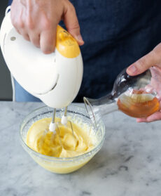 Frullate i tuorli con un frullatore a immersione aggiungendo prima 1 cucchiaio di extravergine e poi olio di vinaccioli a filo finché la maionese sarà montata: durante la preparazione, unite 1 cucchiaio d'aceto, poche gocce per volta (non tutto insieme alla fine) e il vino; salate e mettete in frigorifero.