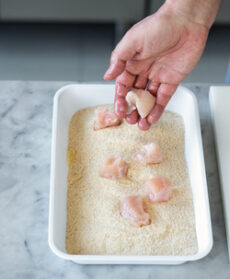 Tagliate i petti di pollo a cubetti regolari. Passateli negli albumi sbattuti e quindi nel pangrattato.