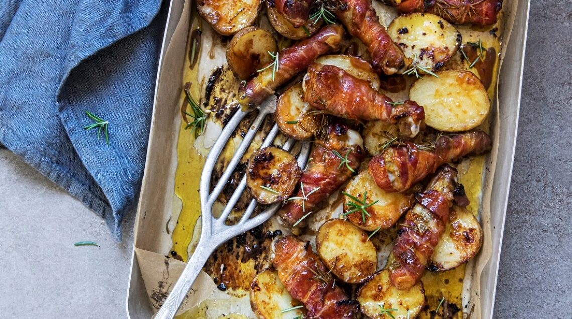 2) Disponete su ogni pezzo un rametto di rosmarino lungo 2-3 cm e avvolgete il tutto con una fetta di bacon. Mescolate la salsa barbecue con l'aceto, lo zucchero di canna e 2 cucchiai d'olio, intingetevi gli involtini preparati e disponeteli su una teglia rivestita con carta da forno. Infornate a 220° per 45 minuti.