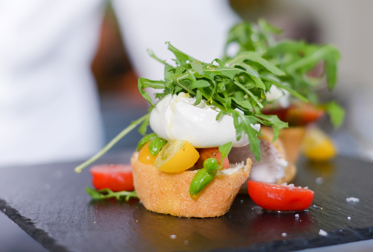 2) Disponete il pollo su un piatto e condite con i pomodirini marinati, la burrata tagliata a metà e la rucola.