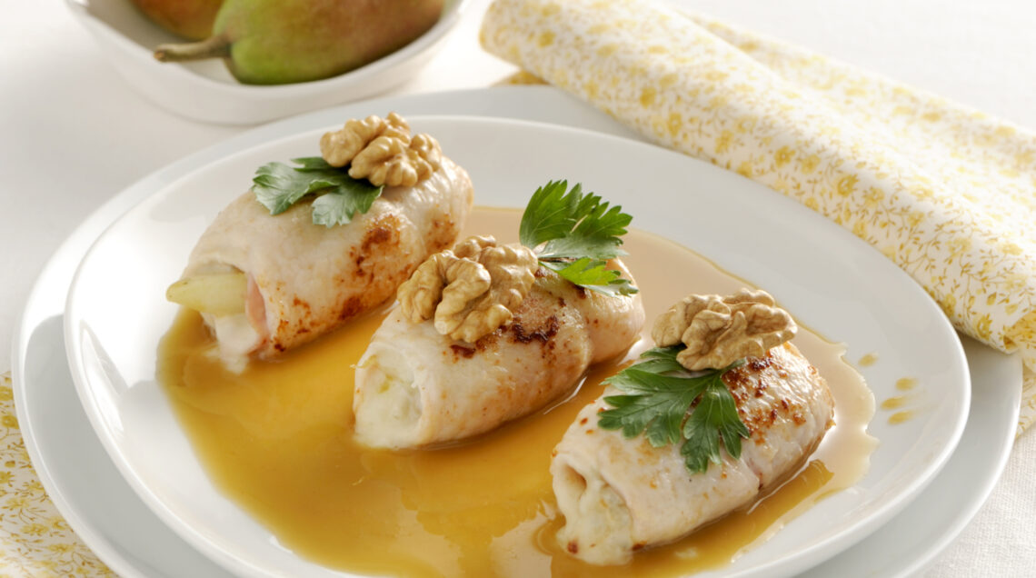 2) Disponi le fettine di pollo sul piano di lavoro e copri ciascuna con una fettina di prosciutto cotto tagliata a misura, lascia libero un margine di 1 cm. Impasta il gorgonzola con il trito di noci, disponine 1 cucchiaio su ogni fettina con 1 spicchietto di pera. Arrotola e fissate con stecchini.