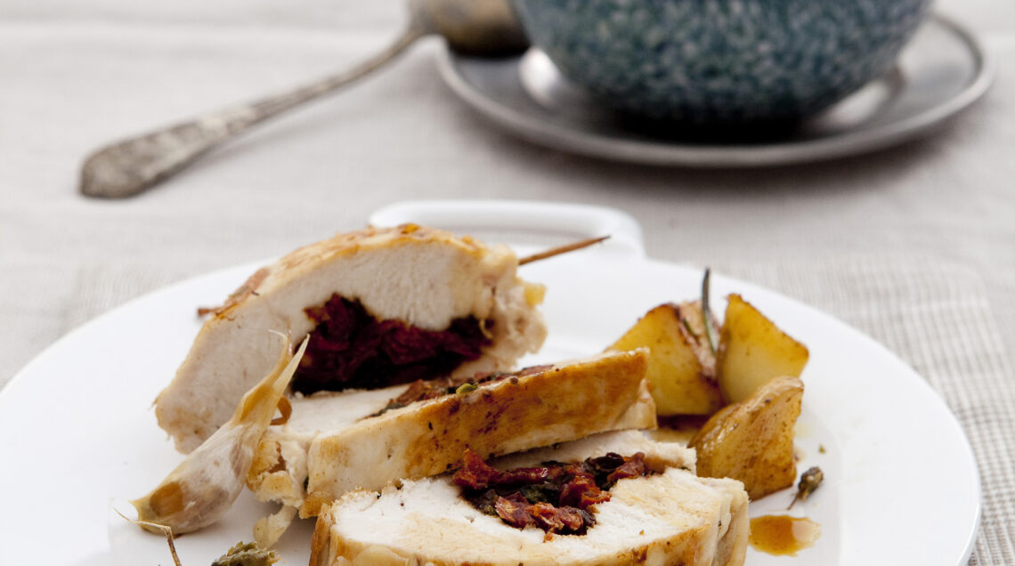 3) Prosegui la cottura in forno caldo a 180° per circa 25 minuti, bagnando di tanto in tanto l'arrosto con il sughetto di cottura. Servi il petto di pollo farcito tiepido, tagliato a fette, con delle patate arrostite.