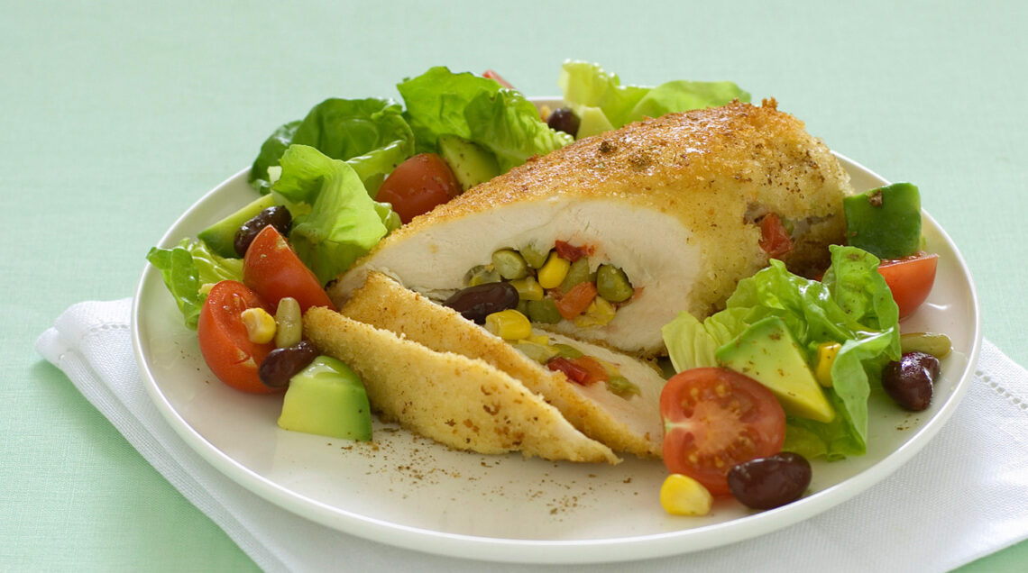 3) Cuoci e completa il petto di pollo ripieno alla messicana. Fodera una placca con la carta da forno, disponi i petti di pollo farciti e impanati e cuocili in forno già caldo a 220° per 25 minuti. Intanto sbuccia l’avocado, taglialo a pezzi e condiscilo con il succo di limone; taglia a metà i pomodorini tenuti da parte. Sfoglia la lattuga, lavala, asciugala e spezzettala. Sforna il petto di pollo ripieno alla messicana e servilo con l’avocado preparato, i pomodorini, le olive nere e la lattuga.