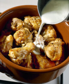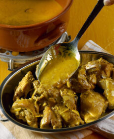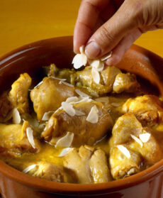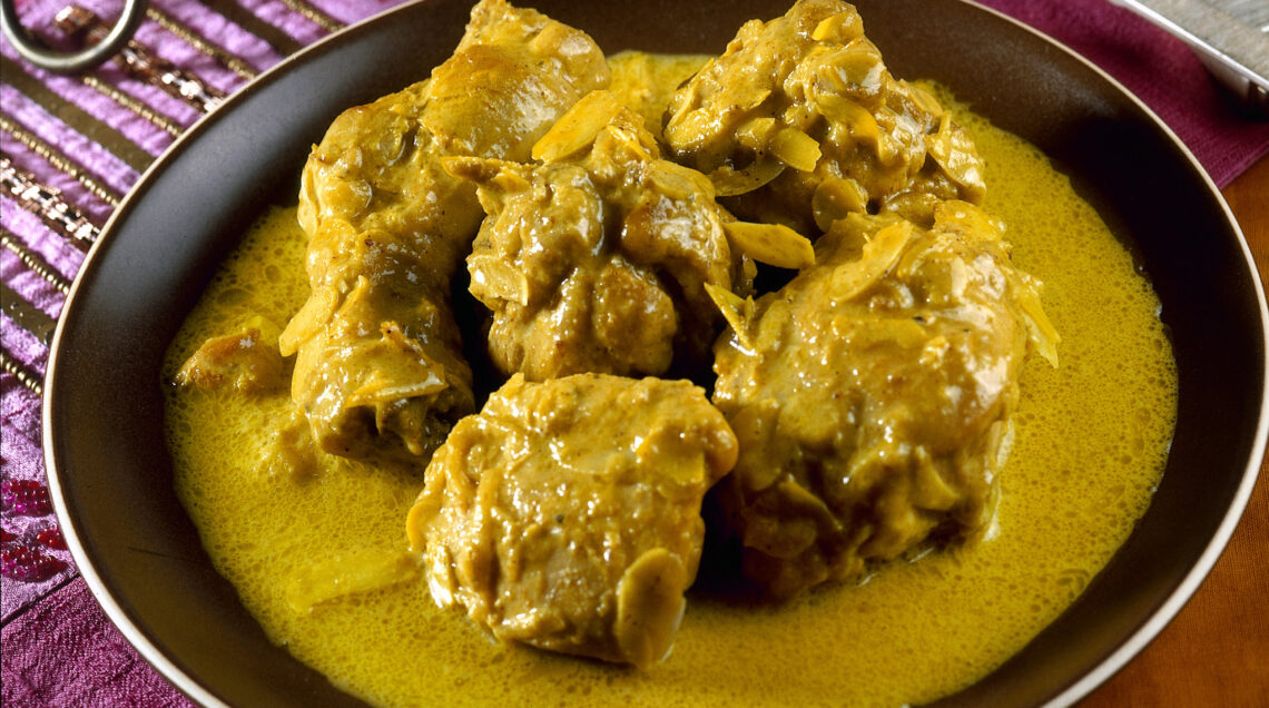Cucinato con yogurt e panna, il pollo è profumato con spezie secondo la tradizione della cucina orientale. Guarnito con mandorle si accompagna a riso basmati