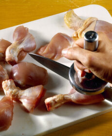 Tagliate le cosce. Incidete la pelle delle cosce per il lungo, eliminatela e dividete ogni coscia in 3 pezzi. Per farlo, preferite un pesante coltello al trinciapollo: incidete la carne e battetevi sopra con un batticarne, così gli ossi si trinceranno di netto senza scheggiarsi.