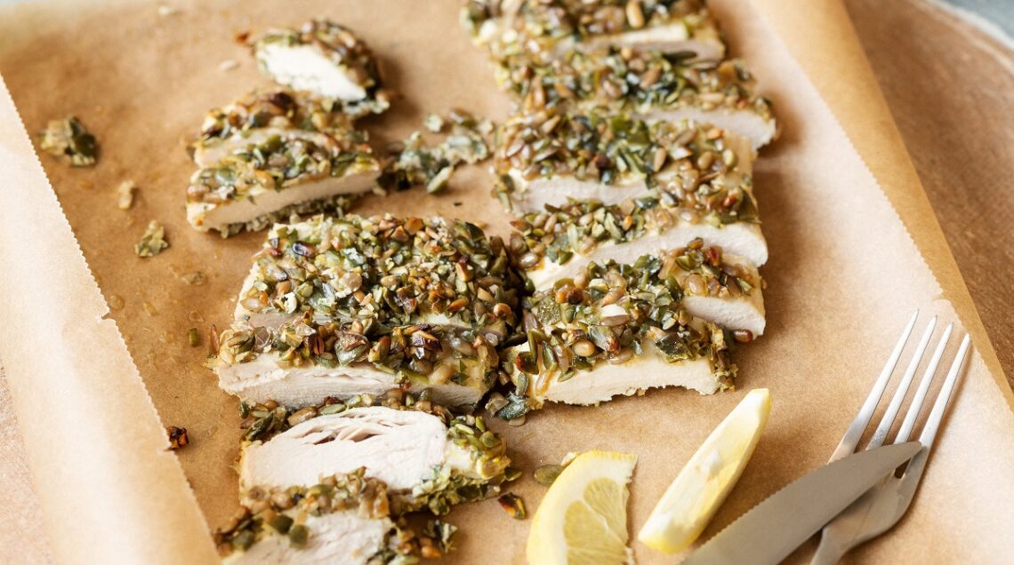 2 Tritate grossolanamente i semi di girasole e di zucca. Passate i mezzi petti nelle uova sbattute e quindi nei semi. Trasferiteli su una placca foderata con carta da forno, condite con ancora un po' d'olio e cuocete in forno caldo a 160° per 20-25 minuti; servite.