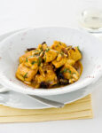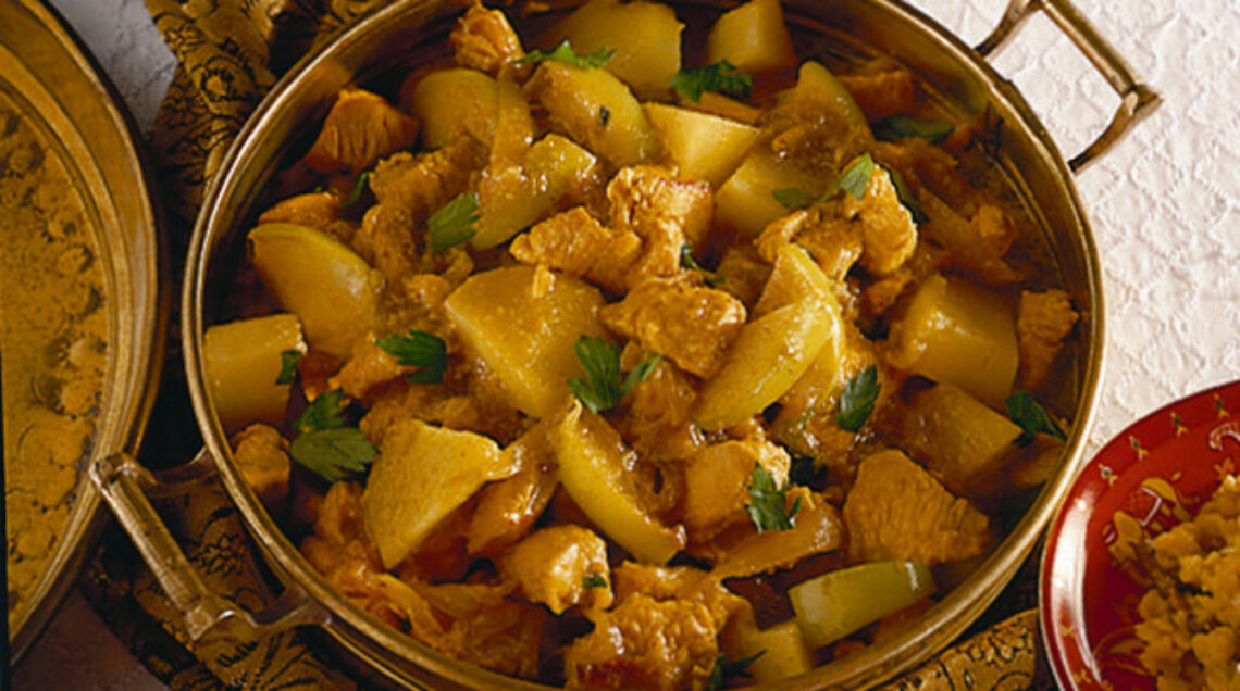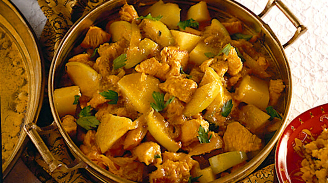 3 Unite i dadi di pollo nel soffritto di cipolla, fateli dorare a fiamma alta per qualche minuto, aggiungete le patate, la mela, un pizzico di sale e pepe e un mestolo di acqua bollente. Coprite e cuoci per circa 15 minuti, mescolando spesso.