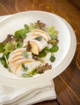 3) Completa e servi il pollo freddo. Sciogli il burro in una padella antiaderente e fai dorare le fettine di bacon arrotolate in modo stretto. Disponi le foglie di lattuga ben distese nei piatti, adagia sopra i pezzi di pollo e il cetriolo con il mais, condisci con la vinaigrette, aggiungi il bacon croccante e caldo. Servi l'insalata di pollo freddo con bacon e mais subito.