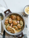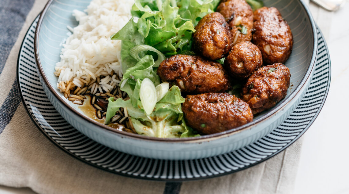3) Completate e servite le polpette teryaki. Versate la salsa sulle polpette e fatele insaporire pochi istanti. Servite le polpette teryaki con il riso Basmati lessato, l'insalata e il cipollotto affettato. Condite con sale e olio extravergine di oliva.