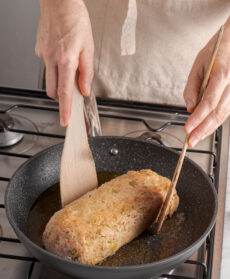 Il polpettone può cuocere in tegame, a vapore o al forno. La rosolatura sigilla i sapori, ma se vi piace particolarmente morbido o temete che in cottura possa sbriciolarsi, avvolgetelo prima a caramella con carta forno.